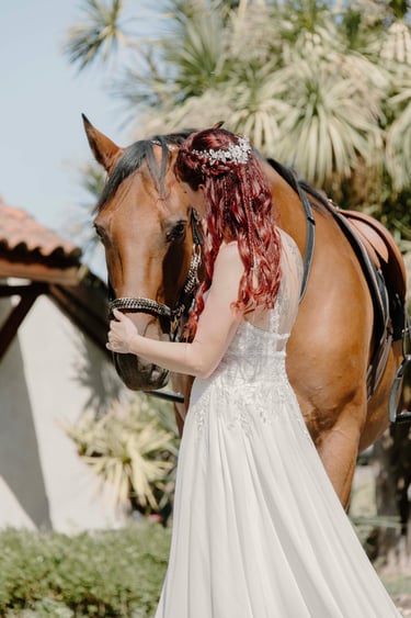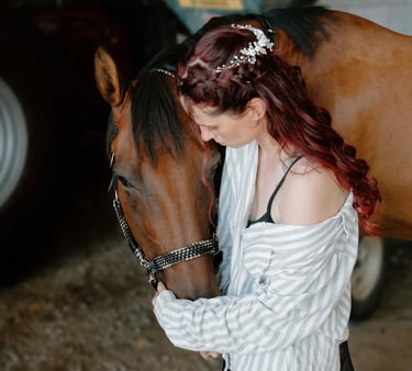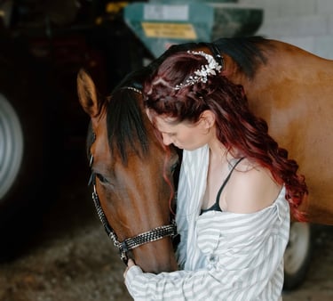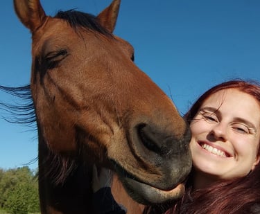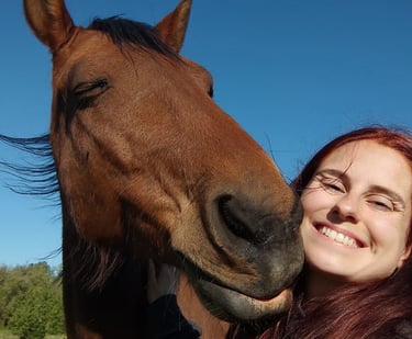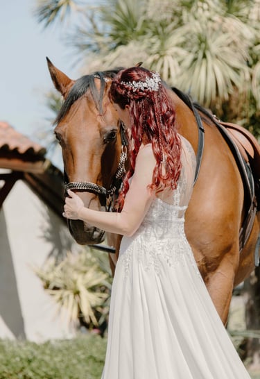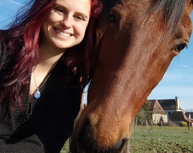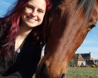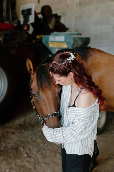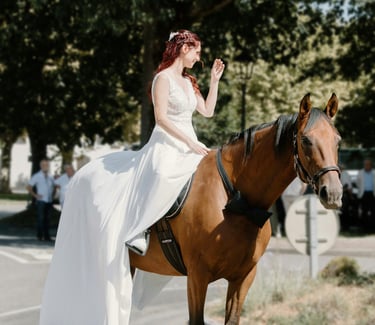 J’ai attendu plusieurs mois avant qu’il ne puisse me rejoindre, et c’est en février 2022 que Camel est arrivé à la maison. Aujourd’hui, il est magnifique, bien portant, et passe ses journées à brouter avec sa compagne de trait. Je monte très rarement sur son dos. Camel n’est pas un cheval que l’on force : il a un caractère bien trempé, mais il est patient, doux et profondément respectueux. Il m'a malgré tout offert l'un des plus beaux souvenirs, car je suis arrivée sur son dos à la mairie le jour de mon mariage.