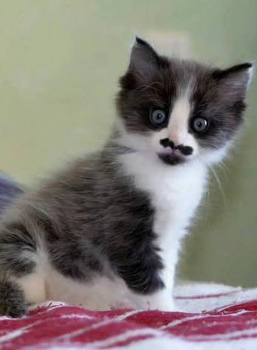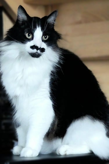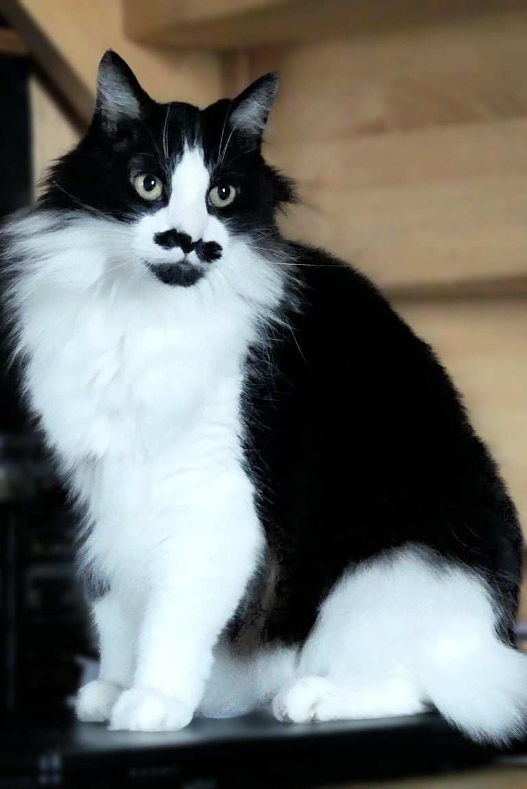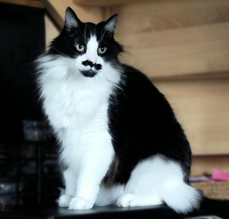 Jacks est un chat blanc et noir au pelage long, de type angora, doux et élégant. Il a plusieurs petites particularités qui le rendent unique : une tache blanche parfaitement placée au milieu du dos, une moustache amusante sous le museau, et ce dernier détail qui fait sourire : on dirait qu’il porte des bottes, tant ses poils s’épaississent au milieu de ses pattes.