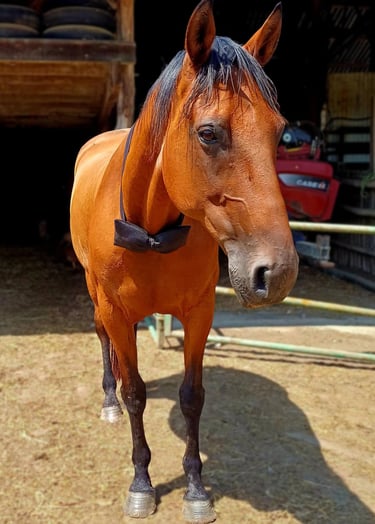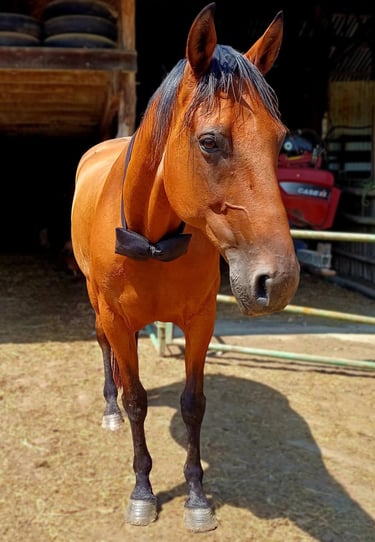 Camel, de son vrai nom Camel Griff, est né le 1er avril 2012. C’est un hongre à la robe baie, d’un joli marron profond, aux crins noirs, parfois traversés de légers reflets auburn. Son pelage ne présente qu’une particularité infime : une tâche blanche sur le museau, presque invisible. Mais ce sont surtout ses autres marques qui racontent son histoire : une cicatrice dans l’œil, et quelques traces sur les flancs qui apparaissent lorsque son poil d’été revient.